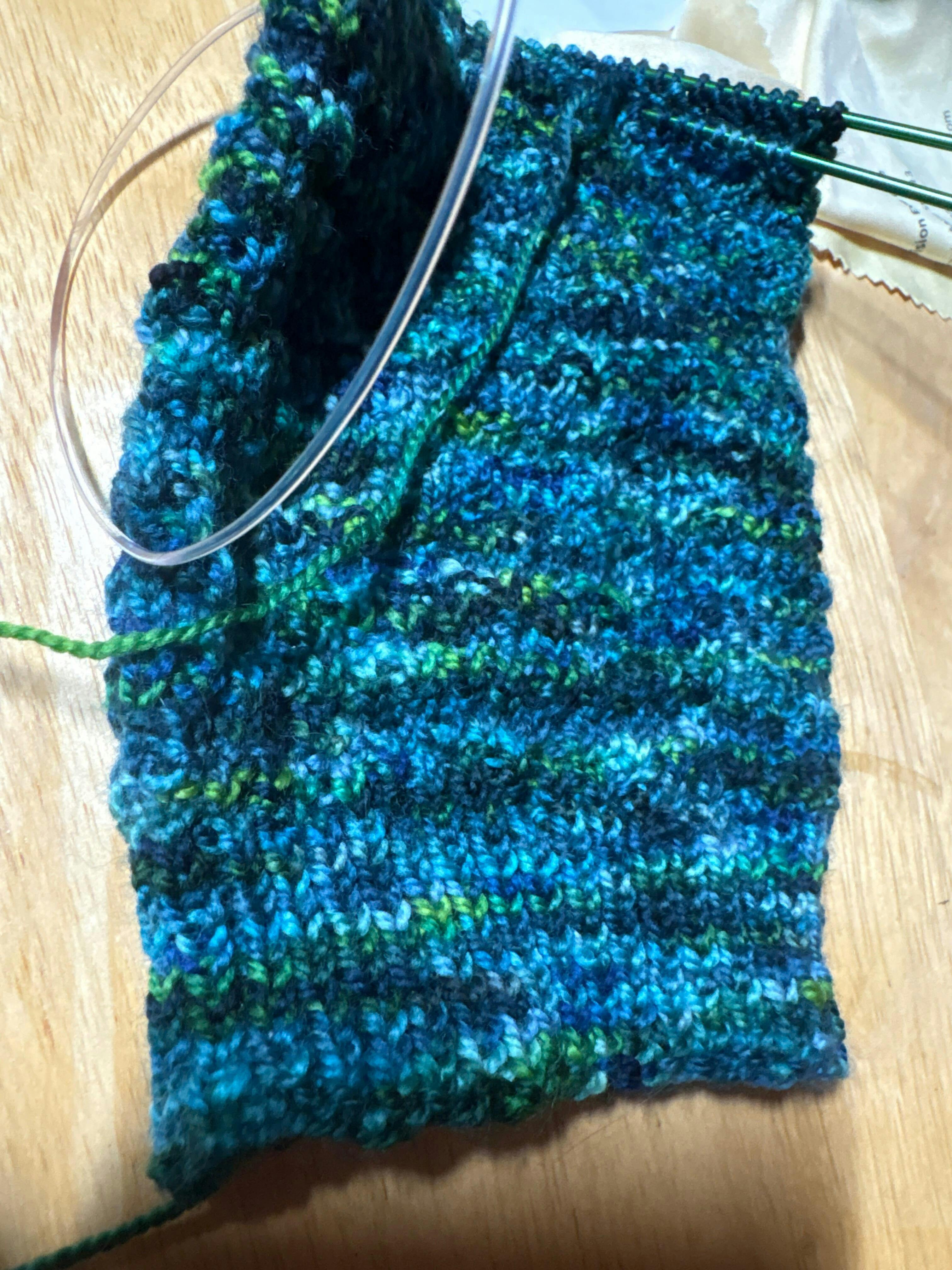 Better Breakfast Fingering, Stone Soup Fingering, Modern Deco Sport, or any plump, springy sock yarn with 400-450 yards per 4 ounces. Substituting yarn and/or needles may result in an overall variation in size or elasticity.