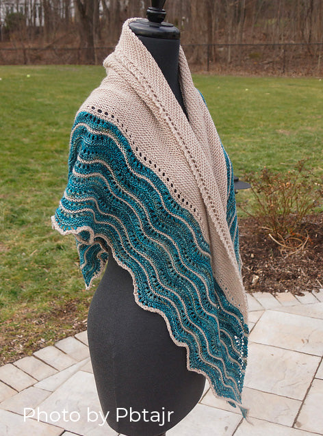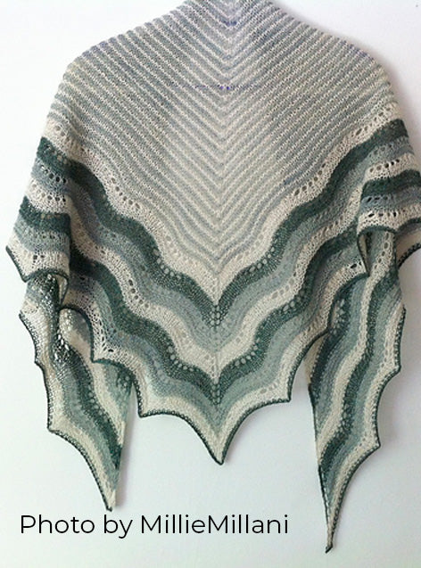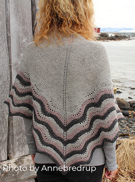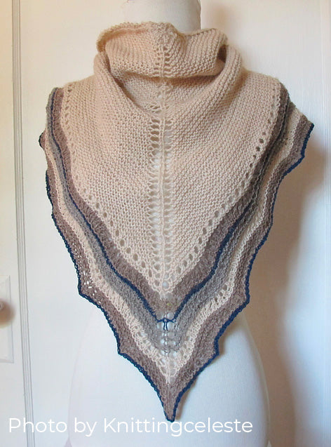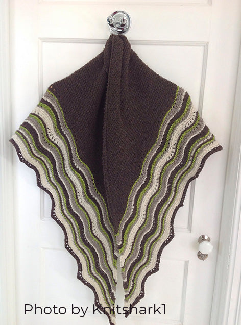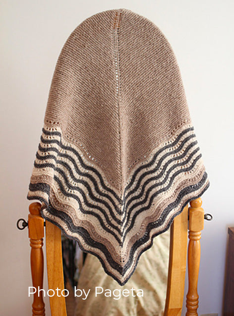 This simple, everyday triangle in three sizes (doll, petite, tall) is distinguished by the fluid drama of its wavy hem, worked in a random mix of natural colors, determined by the knitter. The hem lace is a variation of the feather and fan motif, seen in traditional Scottish hap shawls. This design is a tribute to those timeless beauties, now worked in a modern one-piece construction. Because the hap was a workaday garment, this version is named for the Shetland sheepdog, which also sports a coat of dramatic shading in brown, gray, and white.